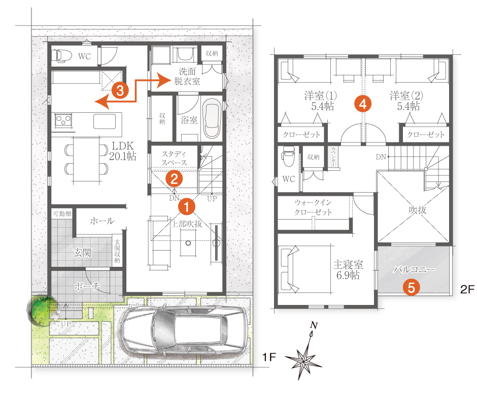 キッチンのすぐ横に洗面脱衣所を配置。家事に配慮した動線を確保。
